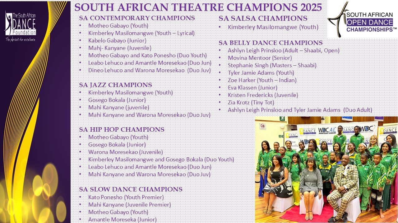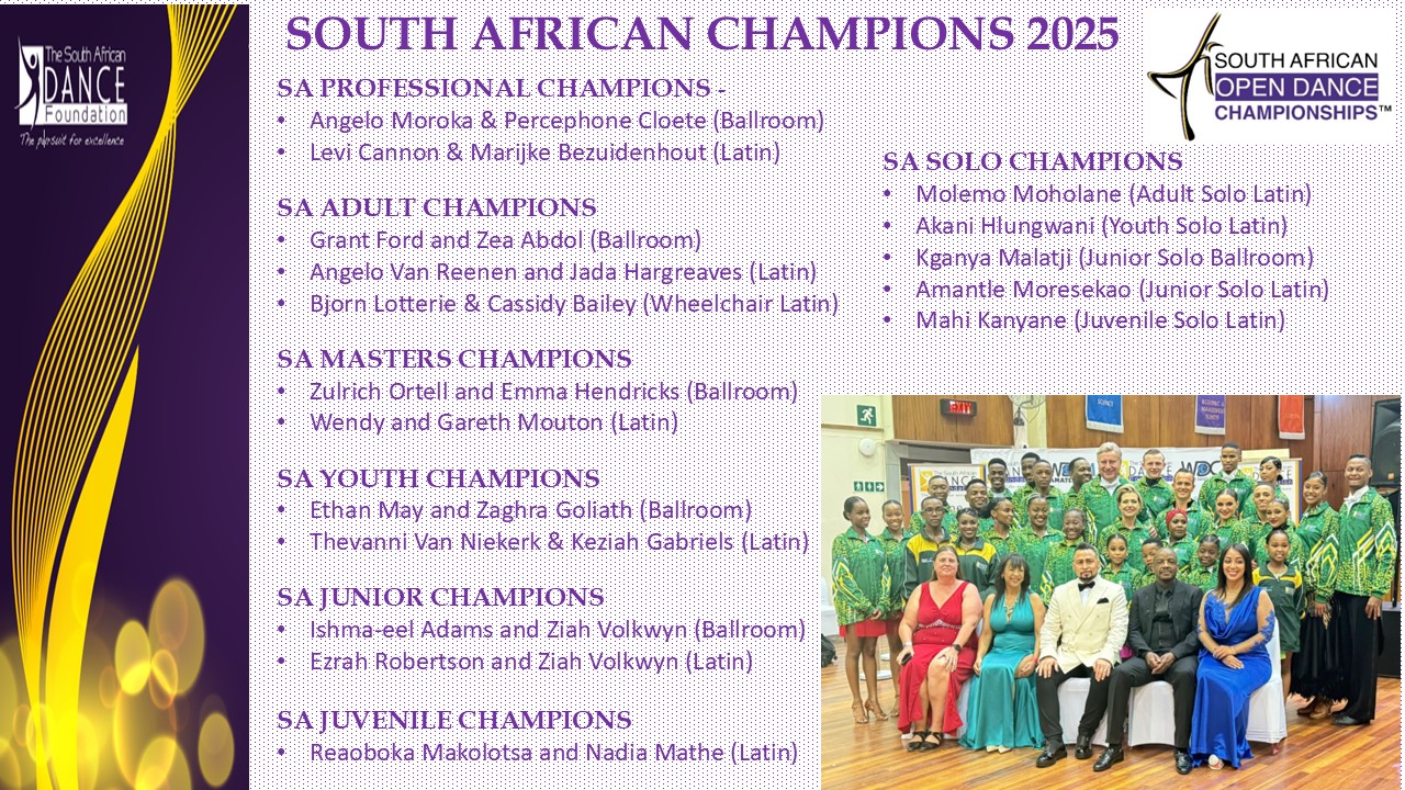 The SADF is a Founder member of the World Dance Council (WDC), established in 1935, member of the WDC Amateur League (WDC AL), member of the International Dance Organisation (IDO) and the Council of International Dance of UNESCO (CID-UNESCO).